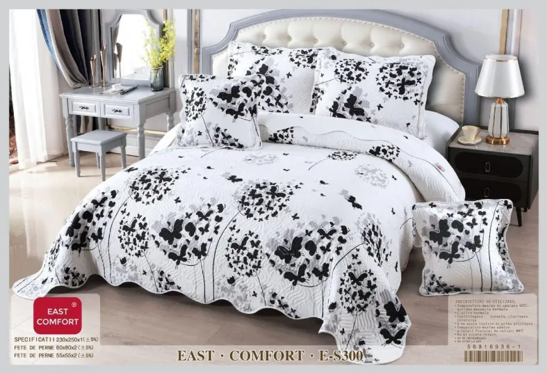 EAST COMFORT Cuvertura matlasata din bumbac 5 piese, alb cu fluturi negri si gri-ES300