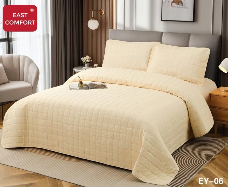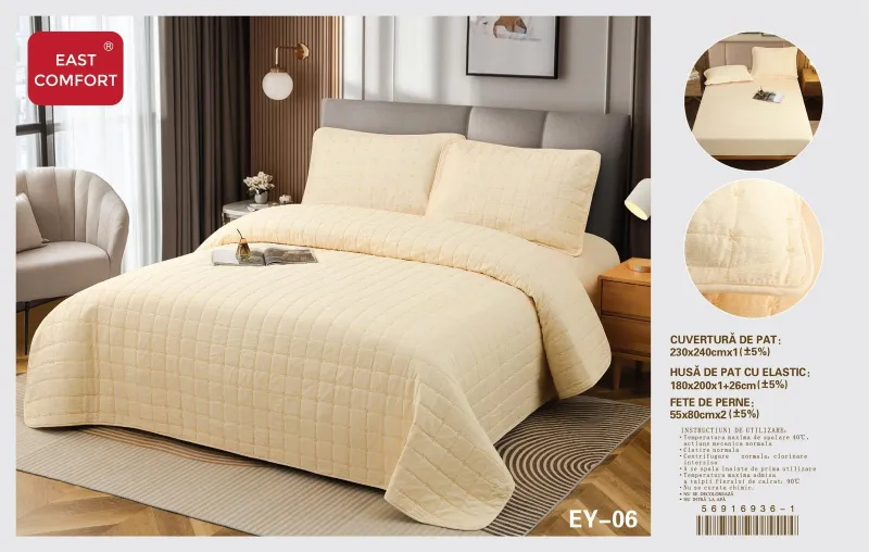 EAST COMFORT Cuvertura+Husa de pat cu elastic+2 Fete de perna,Crem-EY06