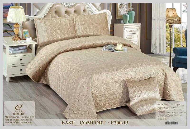 Cuverturile pat  Catifea sunt utilizate pentru decorarea dormitorului dumneavoastra si in acelasi timp de a proteja lenjeria pentru pat de impuritati. Confectionate din bumbac 80% si satin 20%, cuverturile pentru pat sunt decorate cu imprimeuri sofisticate realizate cu masinarii de ultima generatie pentru a oferi o rezistenta sporita in timp. Cuverturile sunt ideale pentru toate anotimpurile. Materialele folosite sunt de calitate buna, produsul putând fi folosit un timp foarte îndelungat. Gama de modele este larga incepand de la modele clasice pana la cele mai moderne designuri, în diferite culori, clare si luminoase.Cuverturile de pat  contureaza perfect un decor remarcabil in orice dormitor.