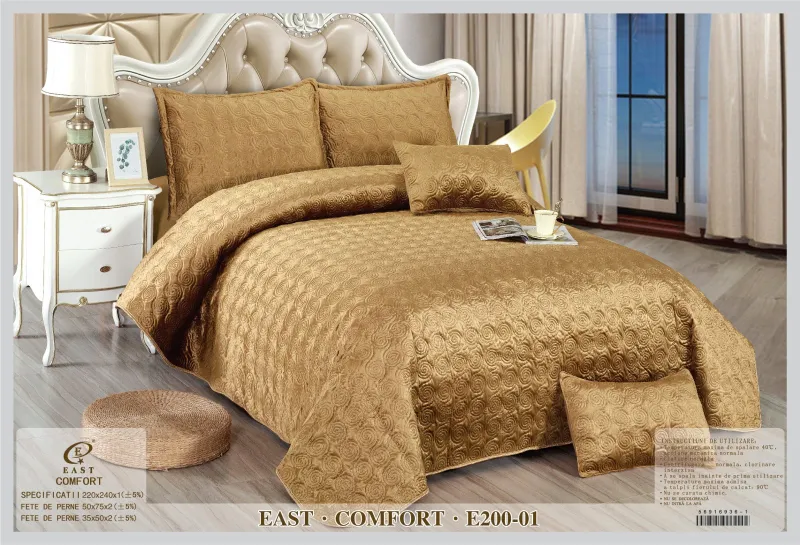 Cuverturile pat Catifea sunt utilizate pentru decorarea dormitorului dumneavoastra si in acelasi timp de a proteja lenjeria pentru pat de impuritati. Confectionate din bumbac 80% si satin 20%, cuverturile pentru pat sunt decorate cu imprimeuri sofisticate realizate cu masinarii de ultima generatie pentru a oferi o rezistenta sporita in timp. Cuverturile sunt ideale pentru toate anotimpurile. Materialele folosite sunt de calitate buna, produsul putând fi folosit un timp foarte îndelungat. Gama de modele este larga incepand de la modele clasice pana la cele mai moderne designuri, în diferite culori, clare si luminoase.Cuverturile de pat contureaza perfect un decor remarcabil in orice dormitor.Pachetul contine: