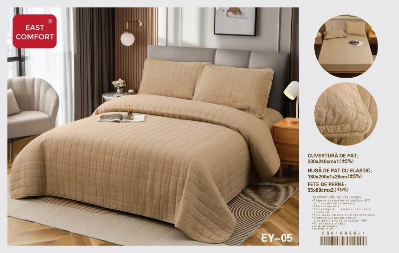 Cuverturile pentru pat sunt utilizate pentru decorarea dormitorului dumneavoastra si in acelasi timp de a proteja lenjeria pentru pat de impuritati. Confectionate din bumbac 80% si satin 20%, cuverturile pentru pat sunt decorate cu imprimeuri sofisticate realizate cu masinarii de ultima generatie pentru a oferi o rezistenta sporita in timp. Cuverturile sunt ideale pentru toate anotimpurile. Materialele folosite sunt de calitate buna, produsul putând fi folosit un timp foarte îndelungat. Gama de modele este larga incepand de la modele clasice pana la cele mai moderne designuri, în diferite culori, clare si luminoase.Cuverturile de pat contureaza perfect un decor remarcabil in orice dormitor.Pachetul contine: