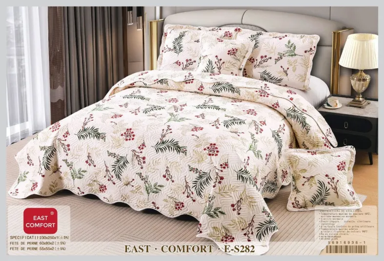 Cuvertura matlasata din bumbac 5 piese, ivoriu cu ramuri si fructe rosii-ES282 sunt utilizate pentru decorarea dormitorului dumneavoastra si in acelasi timp de a proteja lenjeria pentru pat de impuritati. Confectionate din bumbac 80% si satin 20%, cuverturile pentru pat sunt decorate cu imprimeuri sofisticate realizate cu masinarii de ultima generatie pentru a oferi o rezistenta sporita in timp. Cuverturile sunt ideale pentru toate anotimpurile. Materialele folosite sunt de calitate buna, produsul putând fi folosit un timp foarte îndelungat. Gama de modele este larga incepand de la modele clasice pana la cele mai moderne designuri, în diferite culori, clare si luminoase.Cuverturile de pat  contureaza perfect un decor remarcabil in orice dormitor.