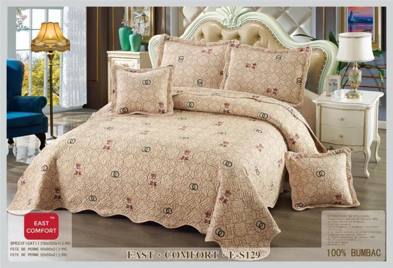 Cuverturile pentru pat sunt utilizate pentru decorarea dormitorului dumneavoastra si in acelasi timp de a proteja lenjeria pentru pat de impuritati. Confectionate din bumbac 80% si satin 20%, cuverturile pentru pat sunt decorate cu imprimeuri sofisticate realizate cu masinarii de ultima generatie pentru a oferi o rezistenta sporita in timp. Cuverturile sunt ideale pentru toate anotimpurile. Materialele folosite sunt de calitate buna, produsul putând fi folosit un timp foarte îndelungat. Gama de modele este larga incepand de la modele clasice pana la cele mai moderne designuri, în diferite culori, clare si luminoase.Cuverturile de pat contureaza perfect un decor remarcabil in orice dormitor.Pachetul contine: