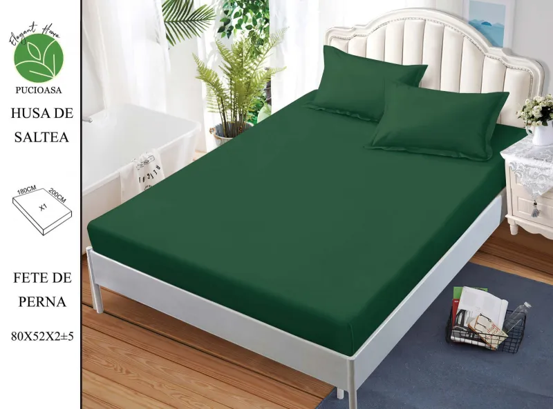 PUCIOASA Husa de pat din Finet cu elastic+ 2 fete de perna 180x200 ,Verde-HG170
