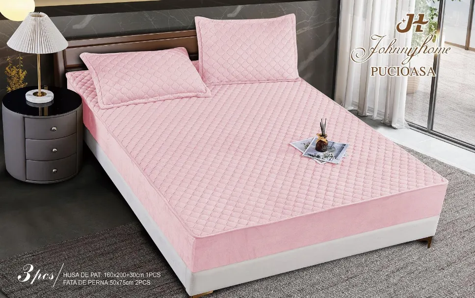 Husa tip Topper cu elastic din catifea 160x200, roz cu model matlasat-TP3
