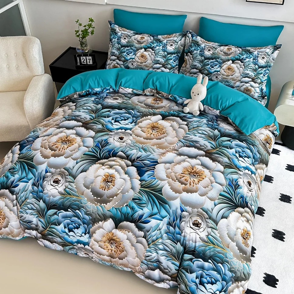 JOJO HOME Lenjerie de pat din finet, albastre cu bujori albi și crem-LD6