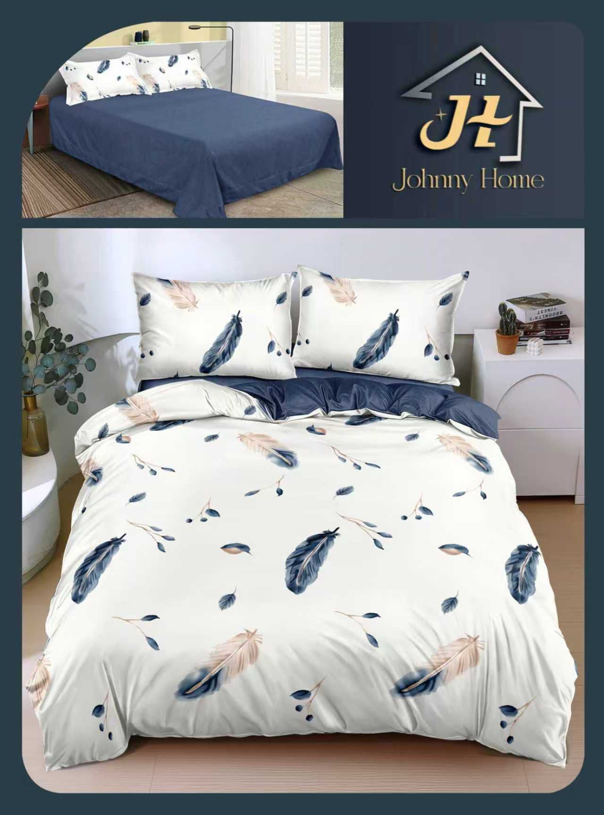 PUCIOASA Lenjerie de pat 4 piese,bumbac satinat Alb și albastru/bleumarin,Pene-BS538