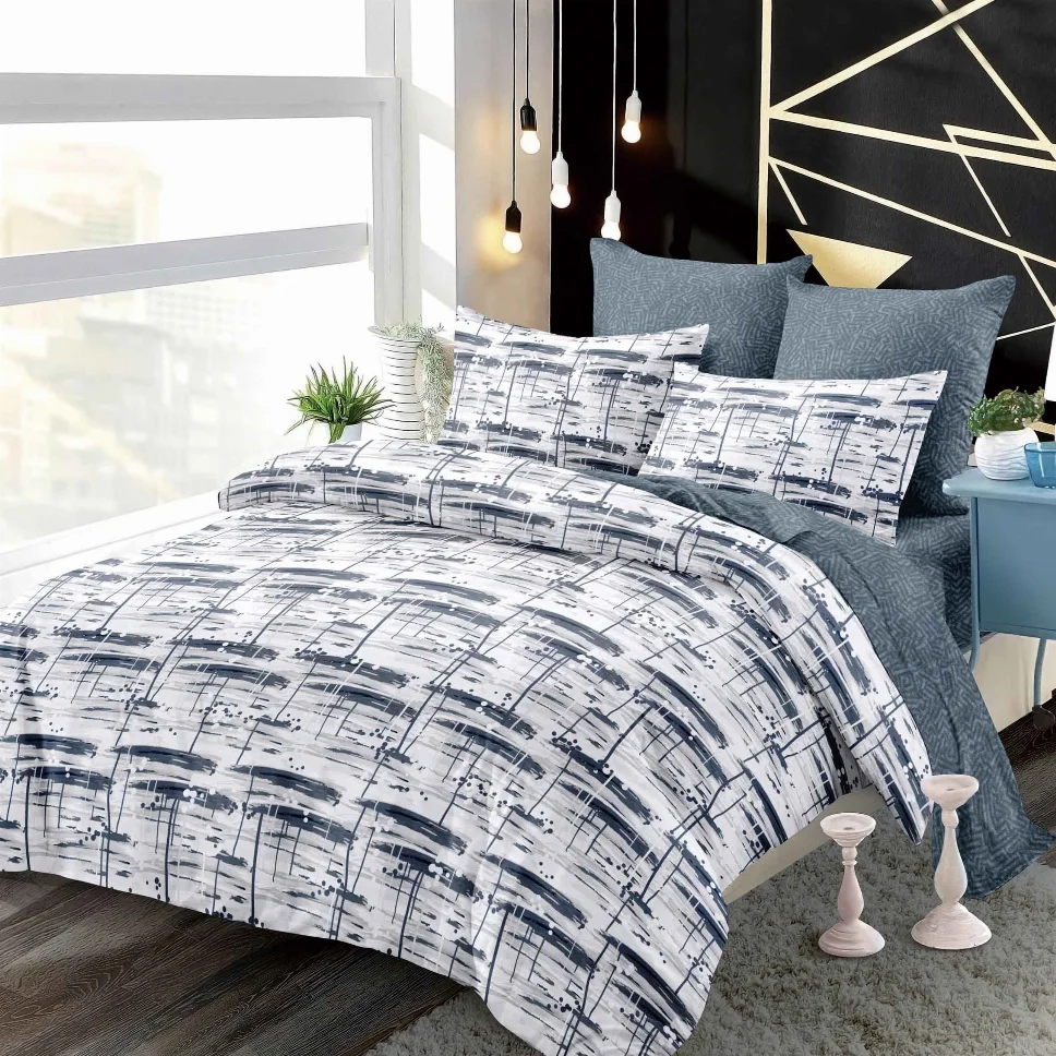Descoperă setul Lenjerii de pat Finet 6 piese cu Elastic, alb cu dungi negre abstracte-FEL289, partenerul tău ideal pentru un somn profund și relaxant. Creat dintr-un material special, plăcut la atingere și rezistent, acest set este conceput pentru a-ți aduce confort și a înfrumuseța aspectul dormitorului tău.