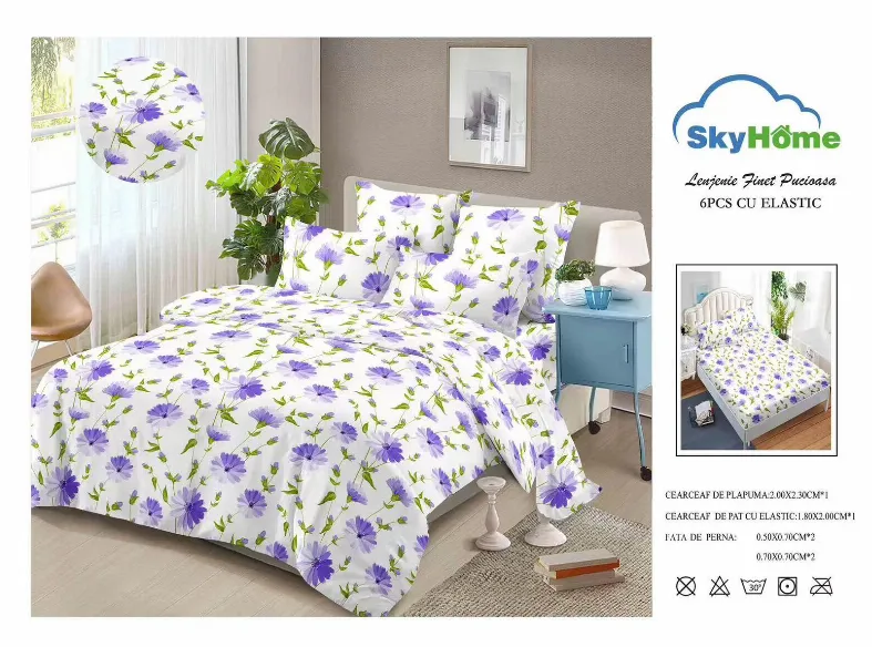 Lenjerii de pat Finet 6 piese cu Elastic, alb cu flori mov-SKE25