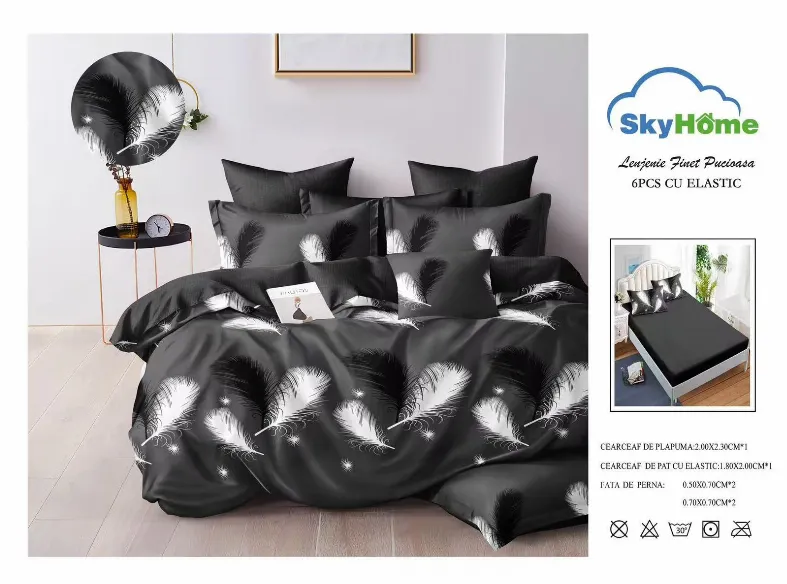 Descoperă Lenjerii de pat Finet 6 piese cu Elastic, gri cu pene albe si negre-SKE30, setul care aduce în dormitorul tău echilibrul perfect între stil și confort practic. Realizată dintr-un material plăcut la atingere și rezistent, această lenjerie este concepută pentru a-ți oferi un somn liniștit și odihnitor, noapte de noapte.
