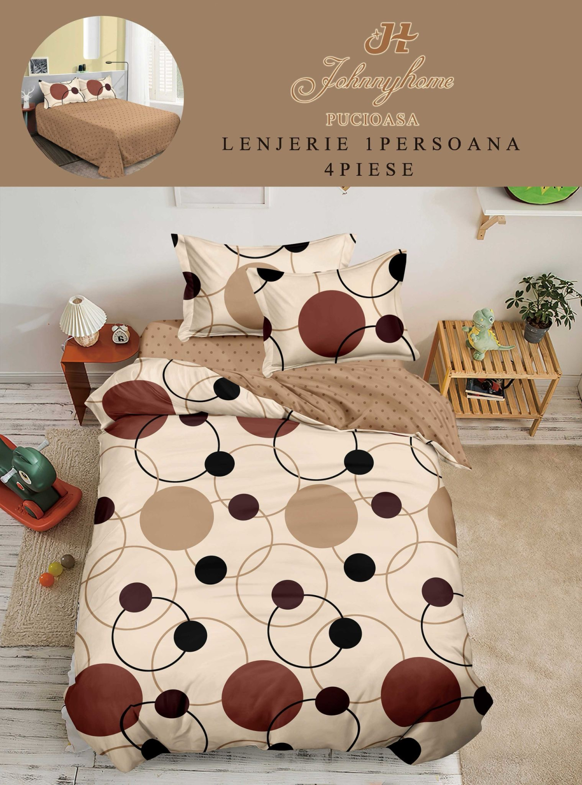 PUCIOASA Lenjerie de pat 1 Persoana,4 piese Buline si cercuri,bej/maro-P79