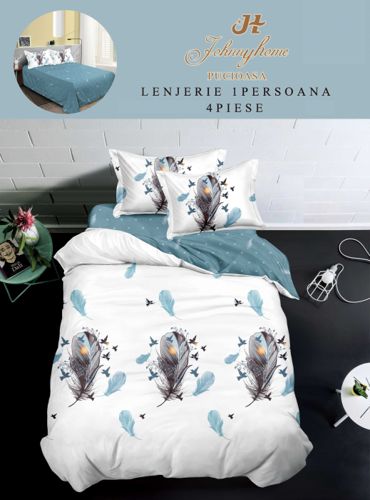 PUCIOASA Lenjerie de pat 1 Persoana,4 piese,Finet.Albastru/alb Pene -P51