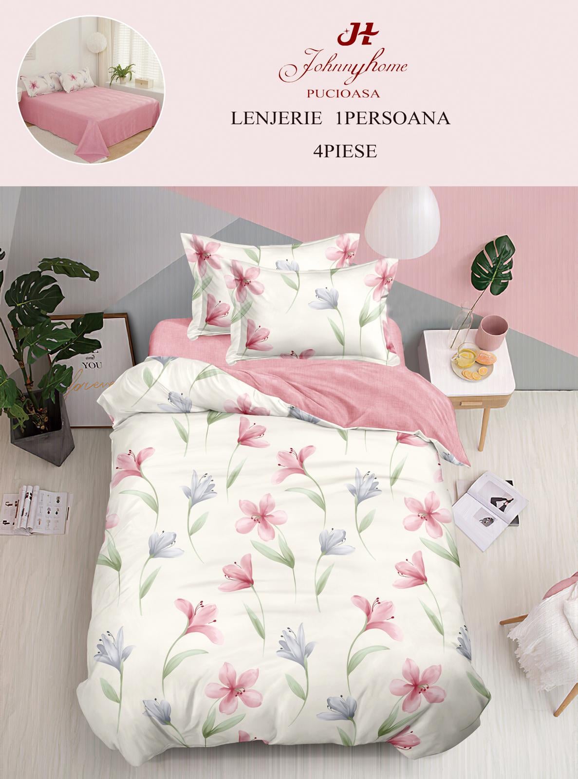 PUCIOASA Lenjerie de pat 1 Persoana,4 piese,Finet,Crem/Roz cu Crini-P54