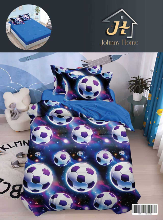 PUCIOASA Lenjerie de pat 1 Persoana cu Elastic,Albastru cu mingii de fotbal-YE163