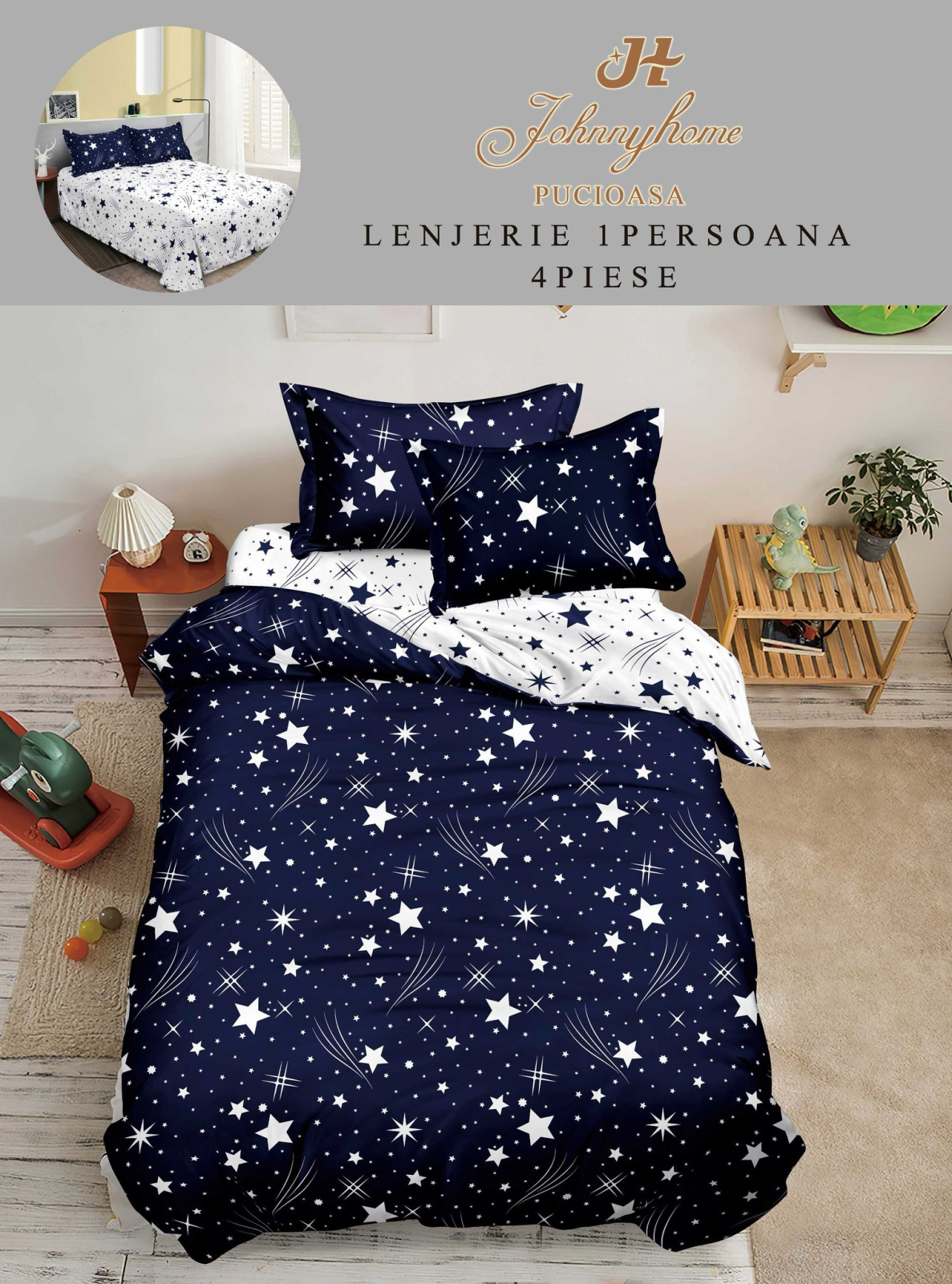 PUCIOASA Lenjerie de pat 1 Persoana,4 piese,Finet.Albastru/alb cu cometeacte -P50