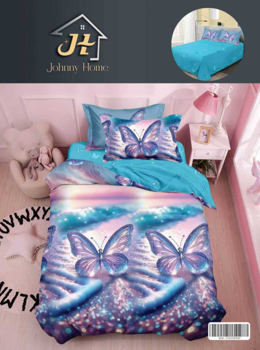 PUCIOASA Lenjerie de pat 1 Persoana,4 piese, fluturi albaștri și mov-P57