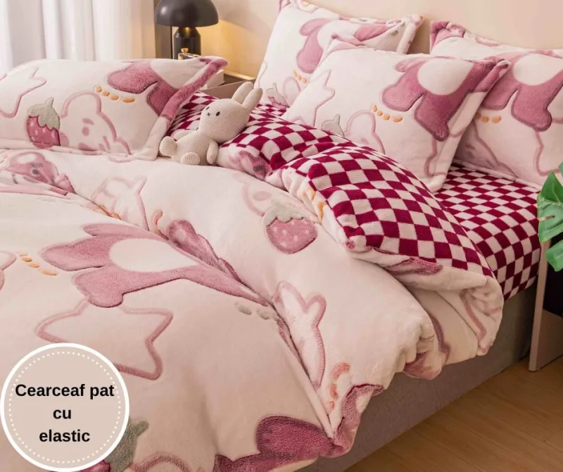 Material: microfibră plușată, groasă și foarte densă (are textura catifelată și este foarte placută la atingere)