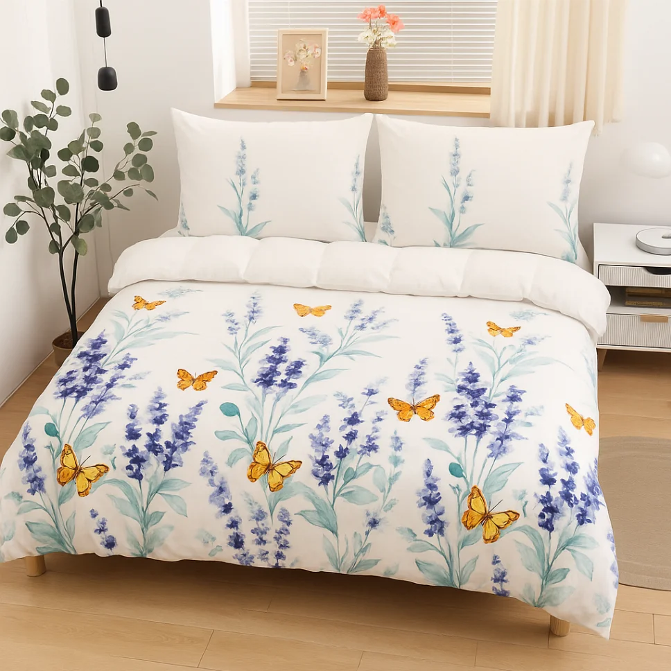 Transformă-ți dormitorul într-un refugiu de căldură și confort în zilele reci cu lenjeria de pat Lenjerie de pat Cocolino 4 piese, alb cu lavandă și fluturi galbeni-LN36. Creată special pentru a te răsfăța, este alegerea ideală pentru un somn profund și relaxant, noapte de noapte.