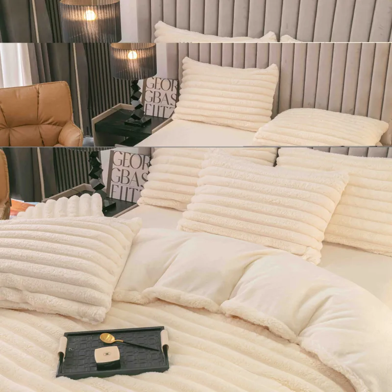 Transformă-ți dormitorul într-un sanctuar al confortului cu Lenjeria de Pat Cocolino cu Blăniță de Iepure Artificială - Set cu 4 Piese pentru Pat Dublu!