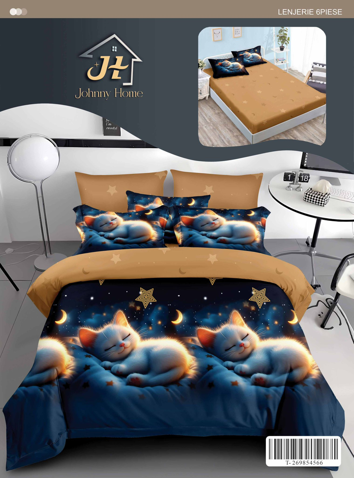 Descoperă confortul absolut cu setul Lenjerii de pat Finet 6 piese cu Elastic, Iprimeu pisica si cer instelat-T336, special conceput pentru a-ți transforma dormitorul într-o oază de relaxare. Această lenjerie de pat din material finet, compusă din 6 piese practice, îți va îmbrăca patul perfect datorită cearceafului de pat cu elastic.