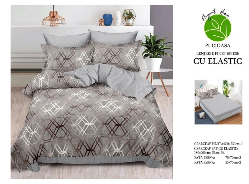 Lenjerii de pat Finet 6 piese cu Elastic-T126, descoperă confortul și rafinamentul oferite de setul de lenjerie de pat tip finet, format din 6 piese, într-o nuanță elegantă. Această colecție excepțională este realizată dintr-un bumbac tratat special, conferind tesaturii sale o senzație moale și durabilitate remarcabilă în timp. Este alegerea perfectă pentru a-ți menține patul mereu proaspăt și impecabil.
