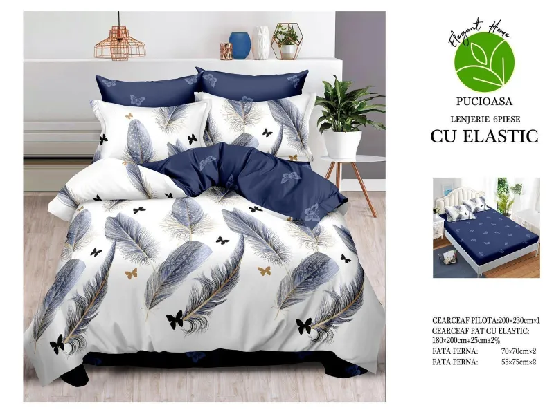 Lenjerii de pat Finet 6 piese cu Elastic-T159, descoperă confortul și rafinamentul oferite de setul de lenjerie de pat tip finet, format din 6 piese, într-o nuanță elegantă. Această colecție excepțională este realizată dintr-un bumbac tratat special, conferind tesaturii sale o senzație moale și durabilitate remarcabilă în timp. Este alegerea perfectă pentru a-ți menține patul mereu proaspăt și impecabil.
