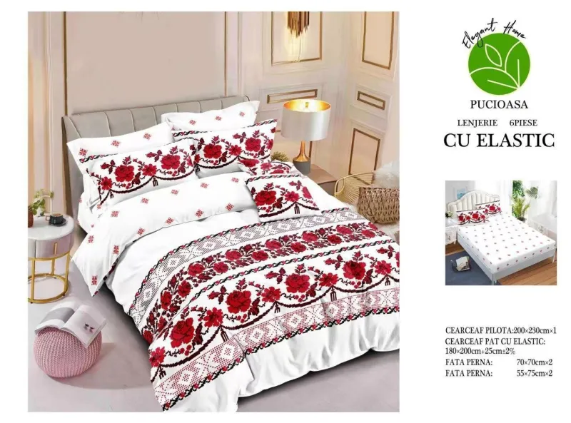Lenjerii de pat Finet 6 piese cu Elastic-T196, descoperă confortul și rafinamentul oferite de setul de lenjerie de pat tip finet, format din 6 piese, într-o nuanță elegantă. Această colecție excepțională este realizată dintr-un bumbac tratat special, conferind tesaturii sale o senzație moale și durabilitate remarcabilă în timp. Este alegerea perfectă pentru a-ți menține patul mereu proaspăt și impecabil.