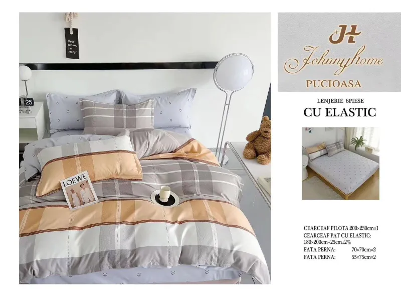 Lenjerii de pat Finet 6 piese cu Elastic-T225, descoperă confortul și rafinamentul oferite de setul de lenjerie de pat tip finet, format din 6 piese, într-o nuanță elegantă. Această colecție excepțională este realizată dintr-un bumbac tratat special, conferind tesaturii sale o senzație moale și durabilitate remarcabilă în timp. Este alegerea perfectă pentru a-ți menține patul mereu proaspăt și impecabil.