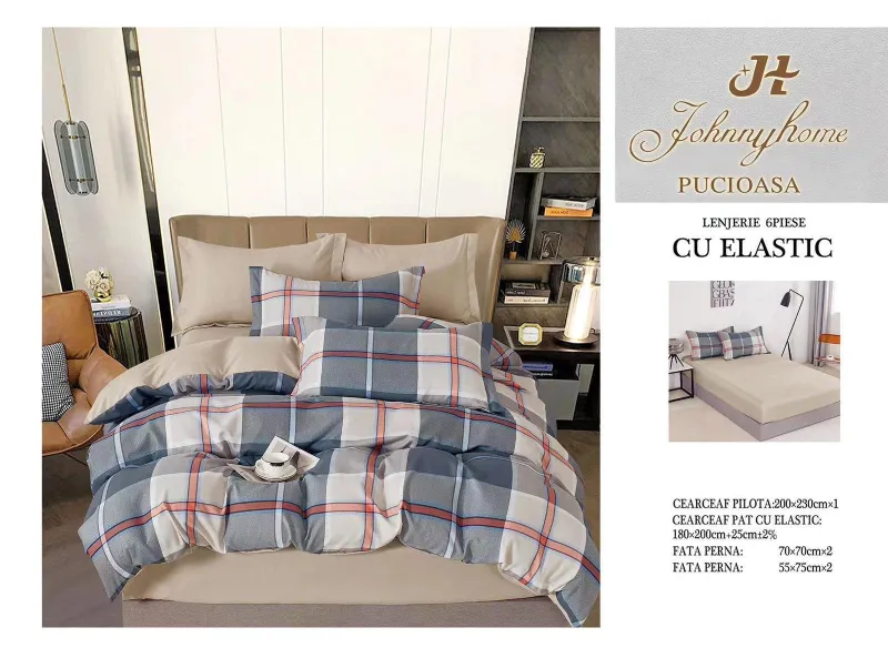 Lenjerii de pat Finet 6 piese cu Elastic-T240, descoperă confortul și rafinamentul oferite de setul de lenjerie de pat tip finet, format din 6 piese, într-o nuanță elegantă. Această colecție excepțională este realizată dintr-un bumbac tratat special, conferind tesaturii sale o senzație moale și durabilitate remarcabilă în timp. Este alegerea perfectă pentru a-ți menține patul mereu proaspăt și impecabil.