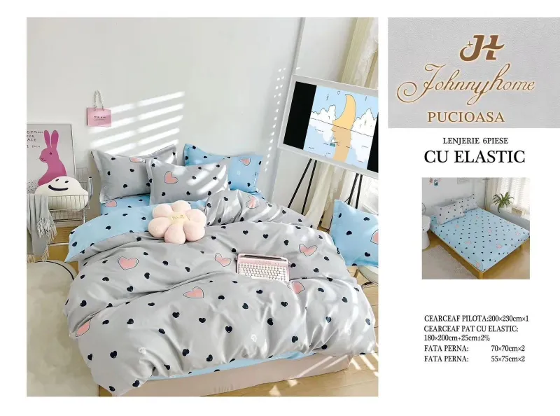 Lenjerii de pat Finet 6 piese cu Elastic-T241descoperă confortul și rafinamentul oferite de setul de lenjerie de pat tip finet, format din 6 piese, într-o nuanță elegantă. Această colecție excepțională este realizată dintr-un bumbac tratat special, conferind tesaturii sale o senzație moale și durabilitate remarcabilă în timp. Este alegerea perfectă pentru a-ți menține patul mereu proaspăt și impecabil.