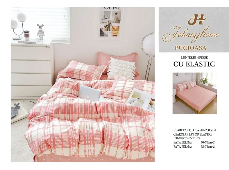 Lenjerii de pat Finet 6 piese cu Elastic-T275, descoperă confortul și rafinamentul oferite de setul de lenjerie de pat tip finet, format din 6 piese, într-o nuanță elegantă. Această colecție excepțională este realizată dintr-un bumbac tratat special, conferind tesaturii sale o senzație moale și durabilitate remarcabilă în timp. Este alegerea perfectă pentru a-ți menține patul mereu proaspăt și impecabil.
