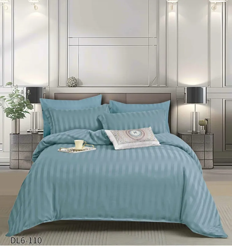 Lenjerie de pat dublu din damasc finetat, linear (tesatura din fabrica, nu imprimata, cu dunga de 1 cm grosime), confectionata din bumbac 70% + 30% poliester, cu 6 piese, folosita cel mai mult in regimul hotelier, datorita simplitatii si calitatii extraordinare. Materialul are un aspect usor lucios pentru o nota de eleganta si rafinament, datorita tesaturii speciale. Damascul este recunoscut pentru rezistenta sa in timp la nenumarate spalari, nemodificandu-si aspectul.