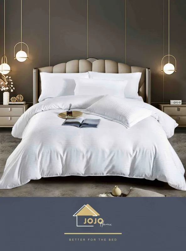 Lenjerie de pat dublu din damasc finetat, linear (tesatura din fabrica, ci nu imprimata, cu dunga de 1 cm grosime), confectionata din bumbac 70% + 30% poliester, cu 6 piese, folosita cel mai mult in regimul hotelier, datorita simplitatii si calitatii extraordinare. Materialul are un aspect usor lucios pentru o nota de eleganta si rafinament, datorita tesaturii speciale. Damascul este recunoscut pentru rezistenta sa in timp la nenumarate spalari, nemodificandu-si aspectul.