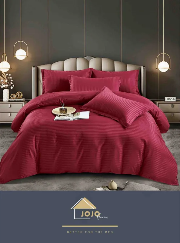 Lenjerie de pat dublu din damasc finetat, linear (tesatura din fabrica, ci nu imprimata, cu dunga de 1 cm grosime), confectionata din bumbac 70% + 30% poliester, cu 6 piese, folosita cel mai mult in regimul hotelier, datorita simplitatii si calitatii extraordinare. Materialul are un aspect usor lucios pentru o nota de eleganta si rafinament, datorita tesaturii speciale. Damascul este recunoscut pentru rezistenta sa in timp la nenumarate spalari, nemodificandu-si aspectul.