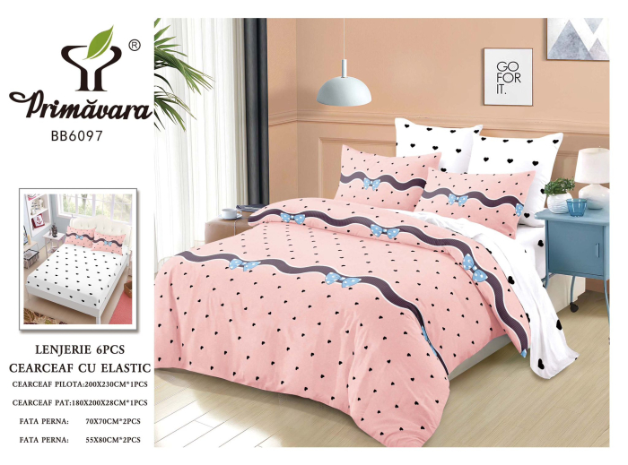 PRIMAVARA Lenjerii de pat Finet 6 piese cu Elastic, Roz cu buline si fundite-FEL405