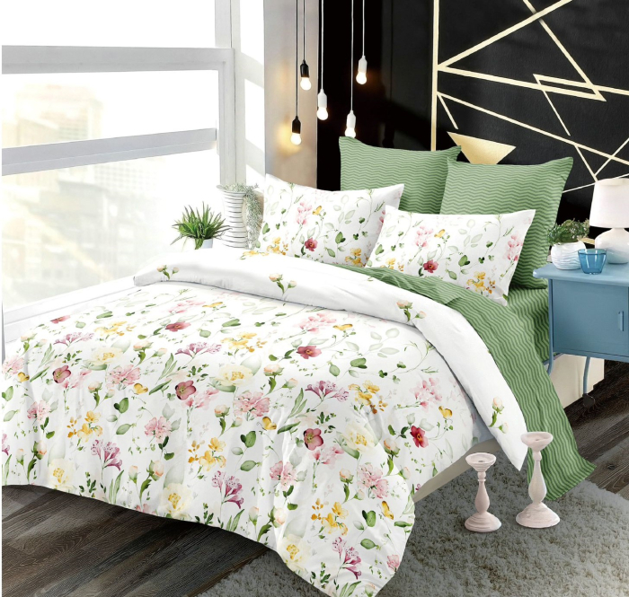 PRIMAVARA Lenjerie de pat Finet 6 piese,Primavara, Alb/Vernil cu floricele-LC154