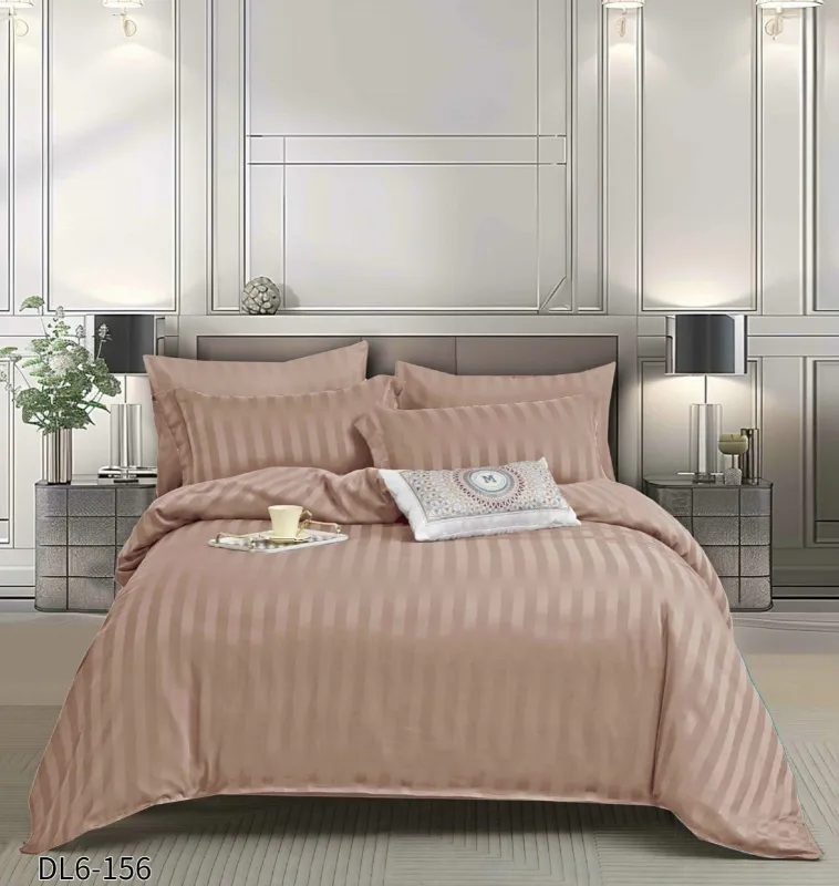 Lenjerie de pat dublu din damasc finetat, linear (tesatura din fabrica, nu imprimata, cu dunga de 1 cm grosime), confectionata din bumbac 70% + 30% poliester, cu 6 piese, folosita cel mai mult in regimul hotelier, datorita simplitatii si calitatii extraordinare. Materialul are un aspect usor lucios pentru o nota de eleganta si rafinament, datorita tesaturii speciale. Damascul este recunoscut pentru rezistenta sa in timp la nenumarate spalari, nemodificandu-si aspectul.