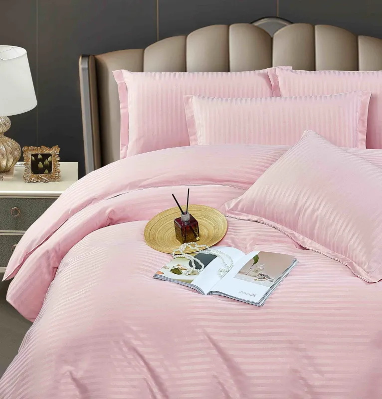 Lenjerie de pat dublu din damasc finetat, linear (tesatura din fabrica, ci nu imprimata, cu dunga de 1 cm grosime), confectionata din bumbac 70% + 30% poliester, cu 6 piese, folosita cel mai mult in regimul hotelier, datorita simplitatii si calitatii extraordinare. Materialul are un aspect usor lucios pentru o nota de eleganta si rafinament, datorita tesaturii speciale. Damascul este recunoscut pentru rezistenta sa in timp la nenumarate spalari, nemodificandu-si aspectul.