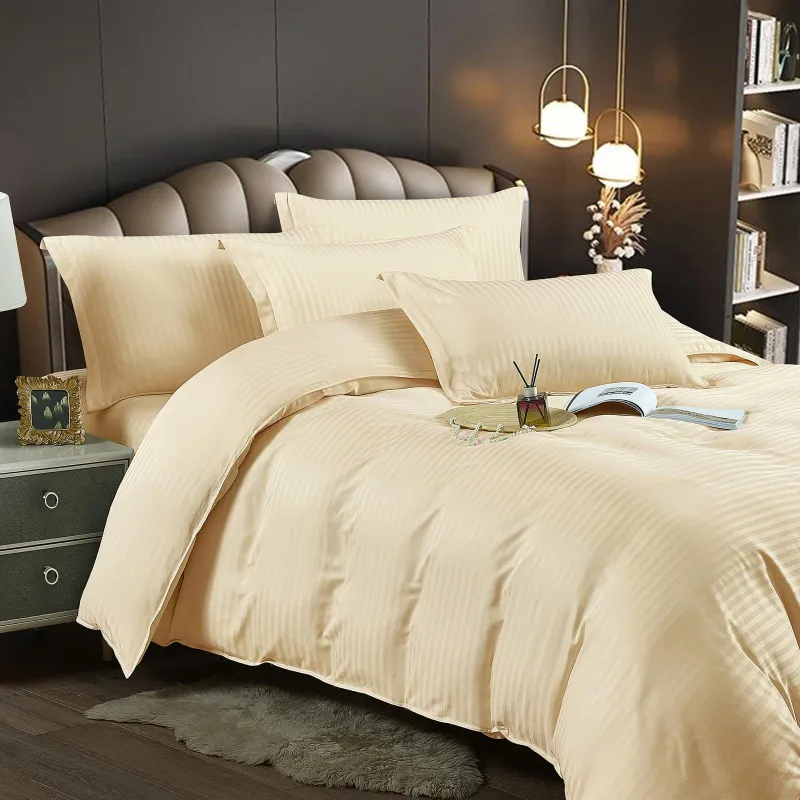 Lenjerie de pat dublu din damasc finetat, linear (tesatura din fabrica, ci nu imprimata, cu dunga de 1 cm grosime), confectionata din bumbac 70% + 30% poliester, cu 6 piese, folosita cel mai mult in regimul hotelier, datorita simplitatii si calitatii extraordinare. Materialul are un aspect usor lucios pentru o nota de eleganta si rafinament, datorita tesaturii speciale. Damascul este recunoscut pentru rezistenta sa in timp la nenumarate spalari, nemodificandu-si aspectul.