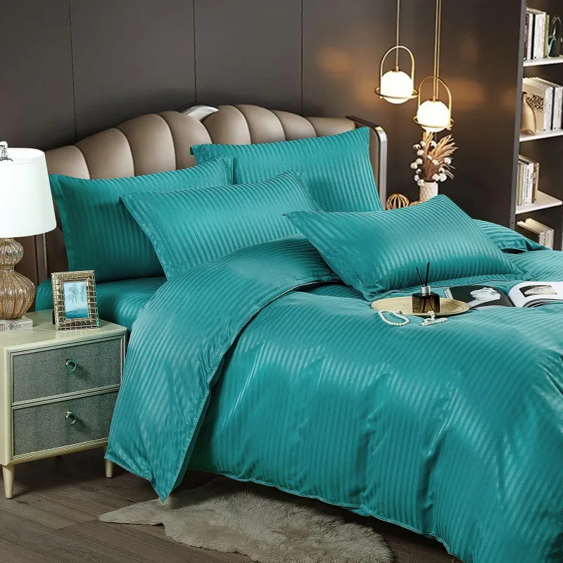 Lenjerie de pat dublu din damasc finetat, linear (tesatura din fabrica, ci nu imprimata, cu dunga de 1 cm grosime), confectionata din bumbac 70% + 30% poliester, cu 6 piese, folosita cel mai mult in regimul hotelier, datorita simplitatii si calitatii extraordinare. Materialul are un aspect usor lucios pentru o nota de eleganta si rafinament, datorita tesaturii speciale. Damascul este recunoscut pentru rezistenta sa in timp la nenumarate spalari, nemodificandu-si aspectul.