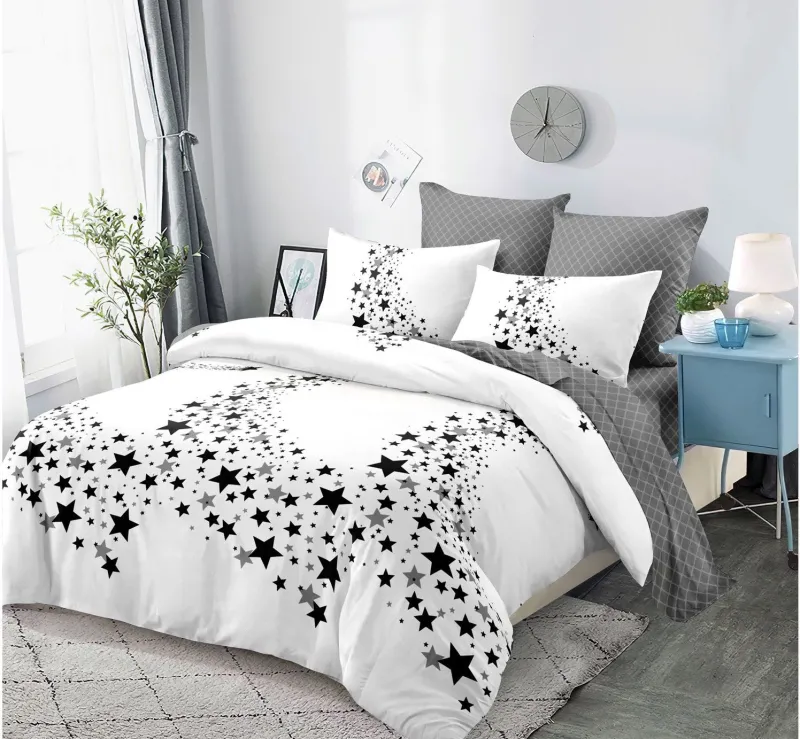 Dormitorul tău merită o transformare, iar cu o Lenjerie de pat Finet 6 piese Primavara,Alb/Gri cu Stelute-LC168, vei aduce un suflu nou de eleganță și confort. Conceput pentru a-ți oferi un somn odihnitor, acest set complet îți învăluie simțurile într-o textură fină și plăcută la atingere, noapte de noapte.