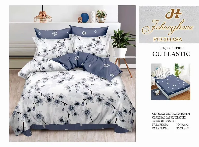PUCIOASA Lenjerii de pat Finet 6 piese cu Elastic, alb cu flori negre si gri-T167 + CADOU