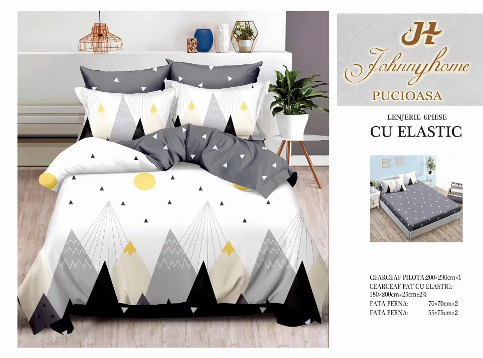 PUCIOASA Lenjerii de pat Finet 6 piese cu Elastic, albe cu munți și soare galben-T91 + CADOU