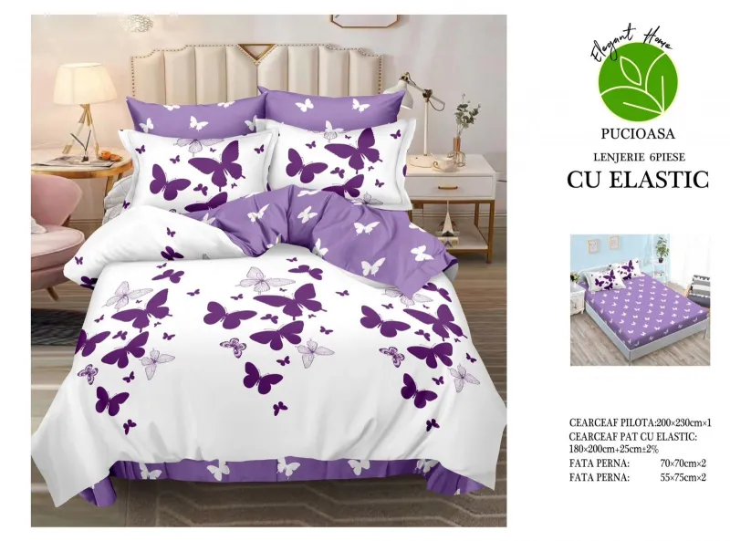 Lenjerii de pat Finet 6 piese cu Elastic-T23, descoperă confortul și rafinamentul oferite de setul de lenjerie de pat tip finet, format din 6 piese, într-o nuanță elegantă. Această colecție excepțională este realizată dintr-un bumbac tratat special, conferind tesaturii sale o senzație moale și durabilitate remarcabilă în timp. Este alegerea perfectă pentru a-ți menține patul mereu proaspăt și impecabil.