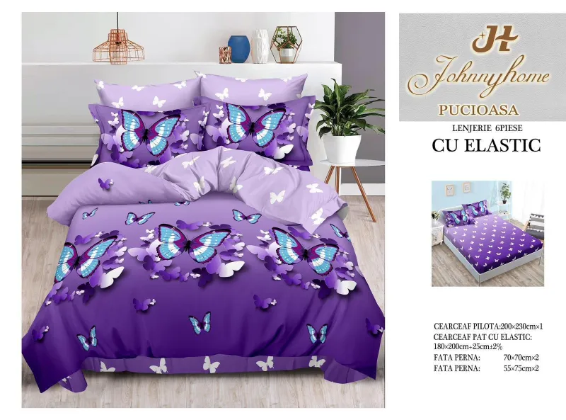 Lenjerii de pat Finet 6 piese cu Elastic-T60, descoperă confortul și rafinamentul oferite de setul de lenjerie de pat tip finet, format din 6 piese, într-o nuanță elegantă. Această colecție excepțională este realizată dintr-un bumbac tratat special, conferind tesaturii sale o senzație moale și durabilitate remarcabilă în timp. Este alegerea perfectă pentru a-ți menține patul mereu proaspăt și impecabil.