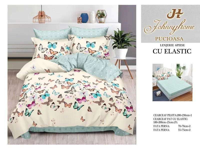 Lenjerii de pat Finet 6 piese cu Elastic-T92, descoperă confortul și rafinamentul oferite de setul de lenjerie de pat tip finet, format din 6 piese, într-o nuanță elegantă. Această colecție excepțională este realizată dintr-un bumbac tratat special, conferind tesaturii sale o senzație moale și durabilitate remarcabilă în timp. Este alegerea perfectă pentru a-ți menține patul mereu proaspăt și impecabil.