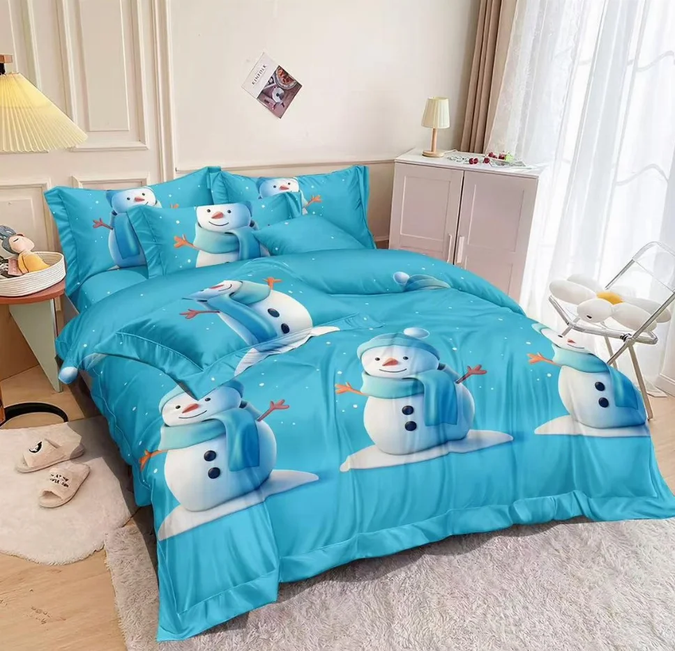 1. Lenjerie de pat din finet 6 piese, albastru cu om de zăpadă vesel-EX12 Descoperiți modele festive cu reni, braduri de Crăciun, zăpadă și multe altele. Aceste designuri aduc un plus de magie la decorul dormitorului dvs.