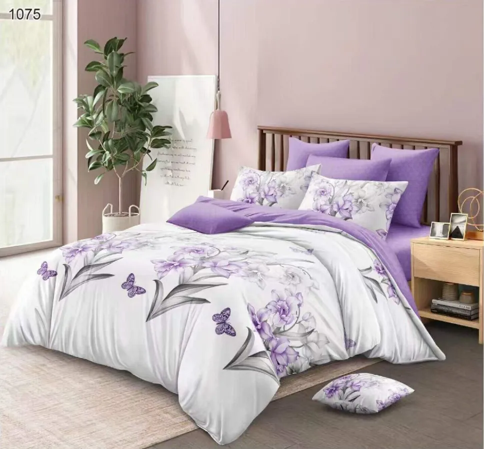 Lenjerie de pat Finet 6 piese, alb cu flori lila și fluturi-LP1075 - Descoperă confortul și rafinamentul oferite de acest set de lenjerie de pat din finet, format din 6 piese. Colecția este realizată dintr-un material textil tratat special, conferind țesăturii o senzație moale la atingere și o durabilitate remarcabilă în timp.