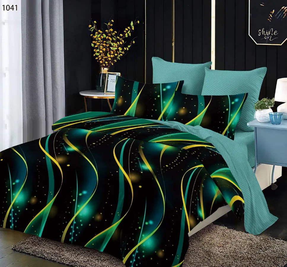 Lenjerie de pat Finet 6 piese, negru cu unduiri verzi si aurii-LP1041 - Descoperă confortul și rafinamentul oferite de acest set de lenjerie de pat din finet, format din 6 piese. Colecția este realizată dintr-un material textil tratat special, conferind țesăturii o senzație moale la atingere și o durabilitate remarcabilă în timp.