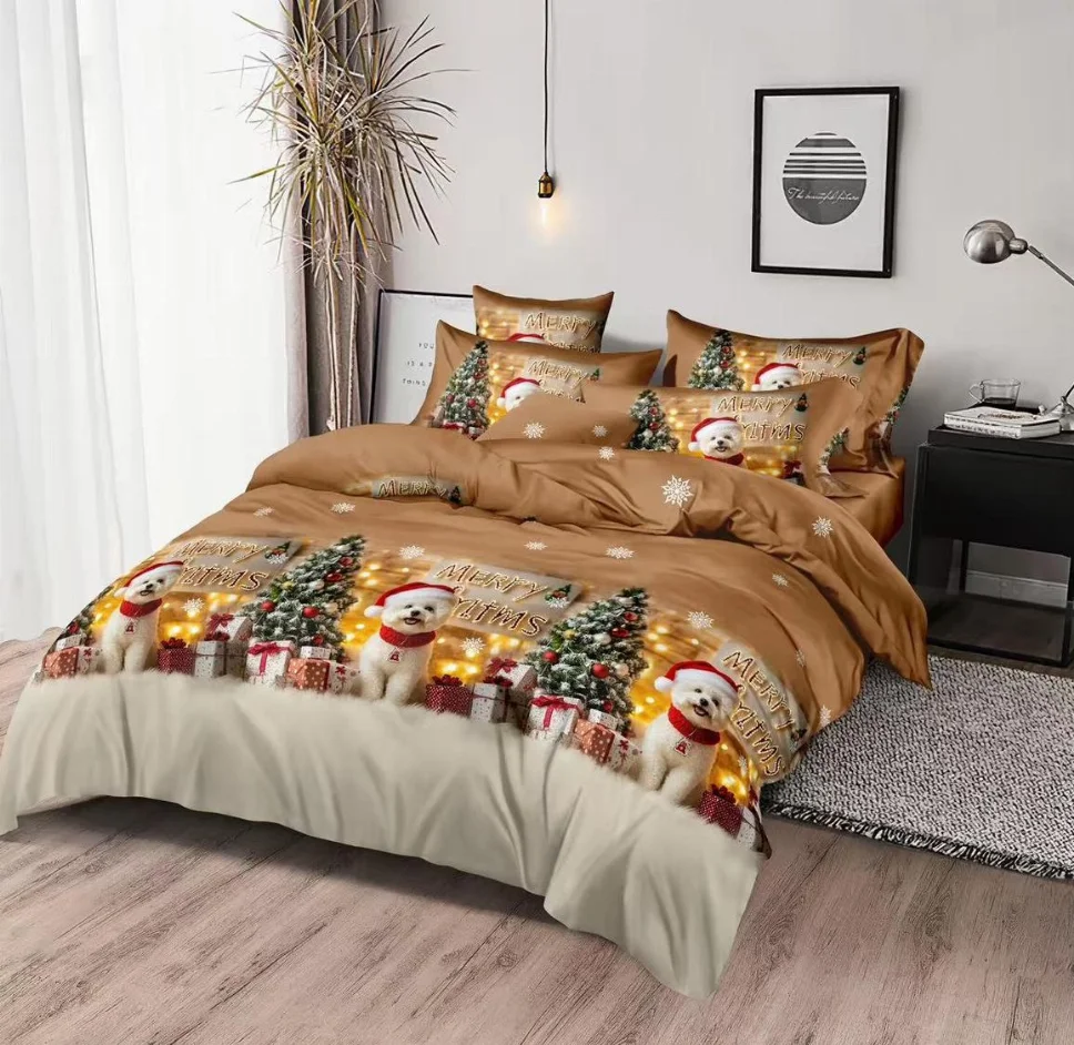 Lenjerie de pat din finet 6 piese, caramel cu căței și brăduți de crăciun-EX14 Descoperiți modele festive cu reni, braduri de Crăciun, zăpadă și multe altele. Aceste designuri aduc un plus de magie la decorul dormitorului dvs.